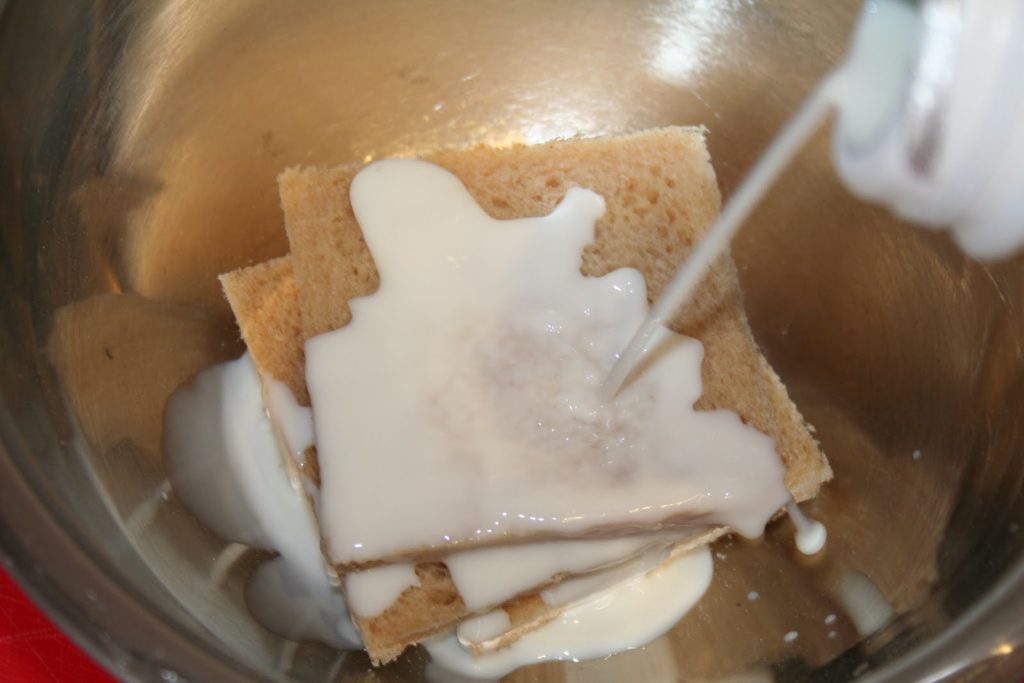 ضعي الفتات في وعاء واسكبي كمية كافية من الحليب لنقعها تمامًا.