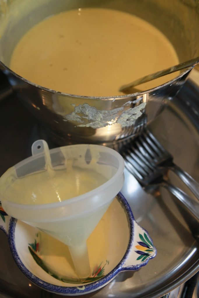 املأ القمع بالخليط وقم بتوصيل الجزء السفلي بإصبعك. ال