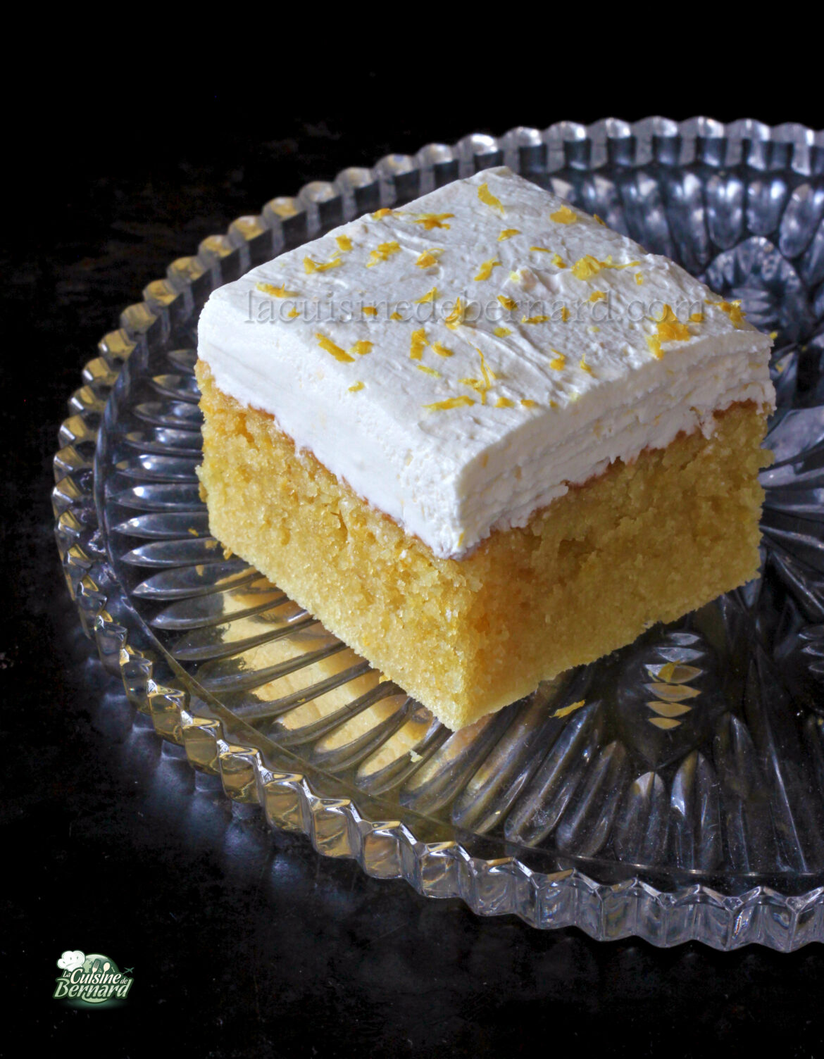 كعكة ليمون رطبة رائعة مغطاة بالليمون والماسكاربوني شانتيلي. هناك القليل من الحلاوة في الحنك تكشف عن النكهات الرائعة لهذه الفاكهة الحمضية الجميلة. لمرة واحدة، قمتُ بخبز الكعكة في فرن غير مهوّى، لإبقائها مسطحة وتجنب حدوث تكتل في الوسط.