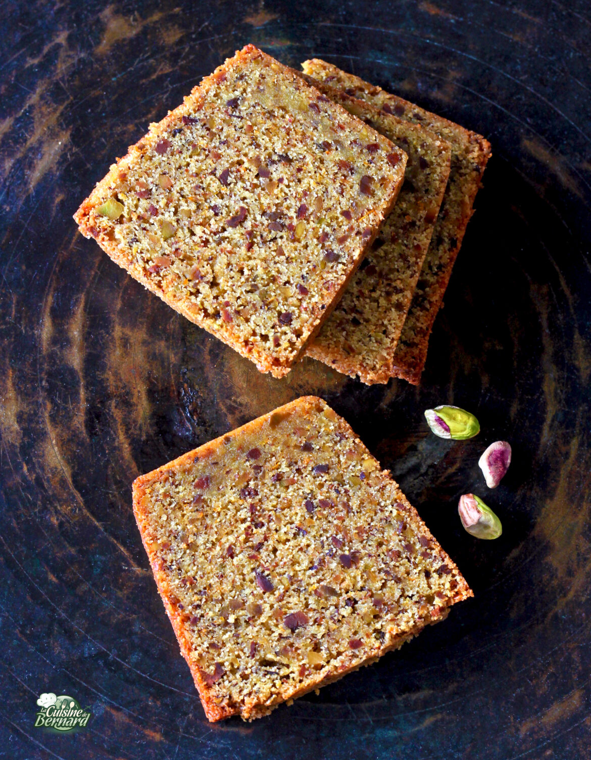 كعكة غنية وكثيفة كما أحبها أحياناً، ولكنها ليست جافة على الإطلاق، بل على العكس تماماً! أستخدم هنا الفستق المحمص وقشر البرتقال وسميد القمح الناعم. والنتيجة عطرة بشكل مدهش. يعطي سميد القمح الناعم، وهو ليس سميد الكسكسي، قواماً مميزاً جداً لهذه الكعكة، ويمتزج البرتقال بشكل رائع مع الفستق.