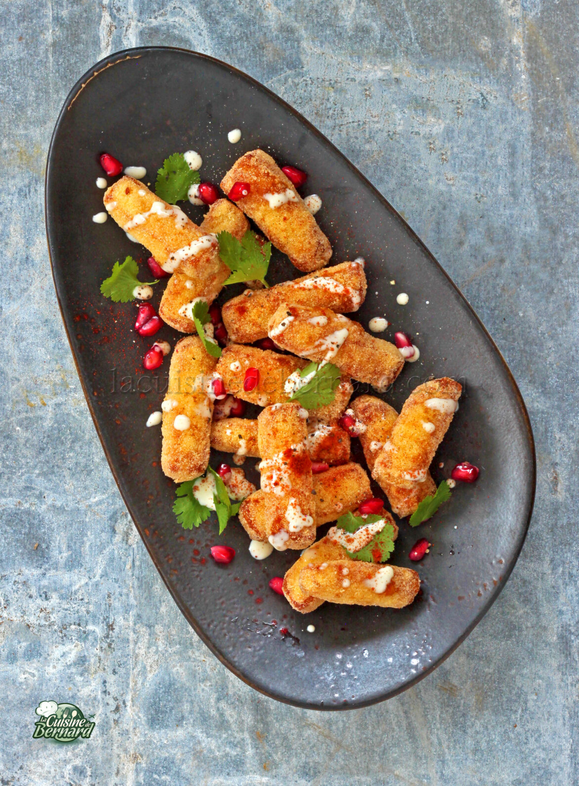 بطاطس مقلية مصنوعة من الحلومي، وهي جبنة قبرصية تُطهى جيداً وتحتفظ بقوامها. هذه البطاطس المقلية رائعة ومقرمشة وخفيفة من الداخل! يُقدم مع صلصة الطحينة (معجون السمسم) وعروق الرمان، فهو طبق أصيل.