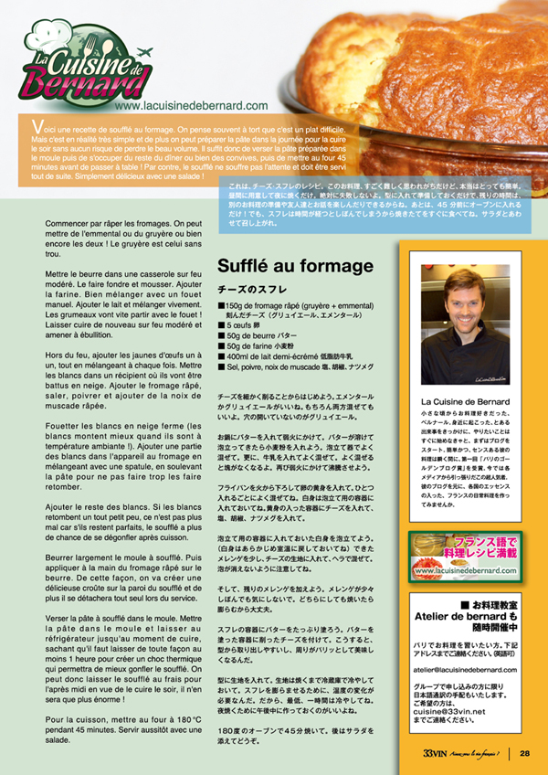 Bonjour à tous ! C’est maintenant au Japon que je suis publié ! Je participe au nouveau magazine « 33vin » dont le premier numéro est diffusé à plusieurs dizaines de milliers d’exemplaires à travers le Japon et les boutiques japonaises à Paris. Celui-ci est gratuit. Il traite de vin et on m’a demandé si je voulais donner certaines de mes recettes pour des accords avec certains vins ! J’ai bien évidemment dit oui et je trouve le résultat très amusant ! J’ai une page entière consacrée à ma rubrique et je participerai aux numéros suivants. Alors bravo « 33vin  » et longue vie !!