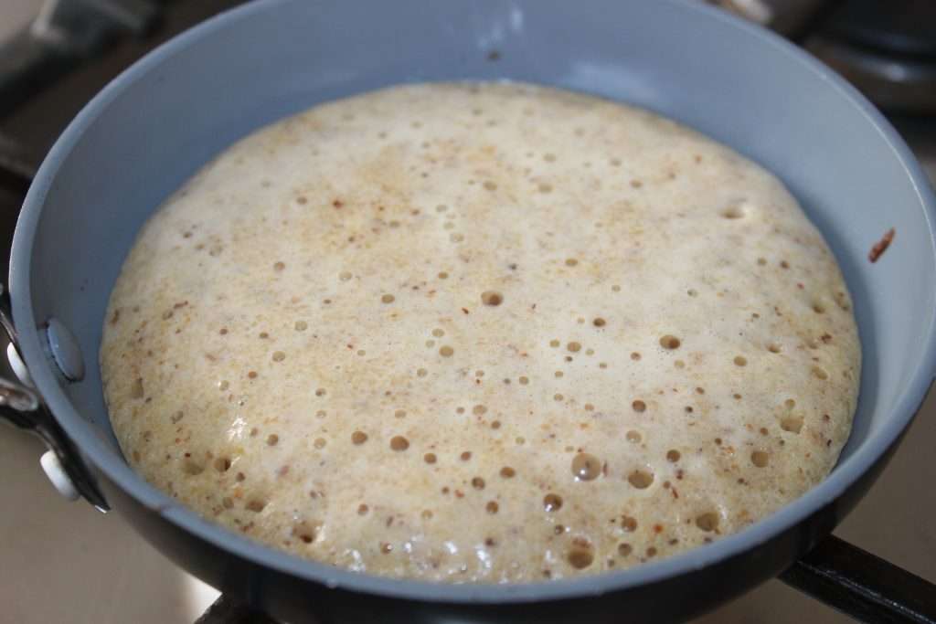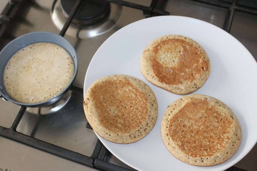 Heat a small frying pan over moderate heat. Pour a little bit of the dough (about 5mm thick).