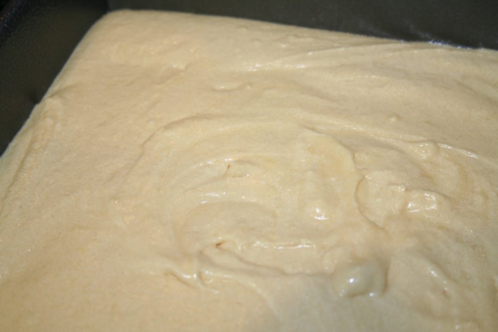 Pour the batter into a 21cm x 21cm square pan, lined with parchment paper. Spray with a can of release grease.