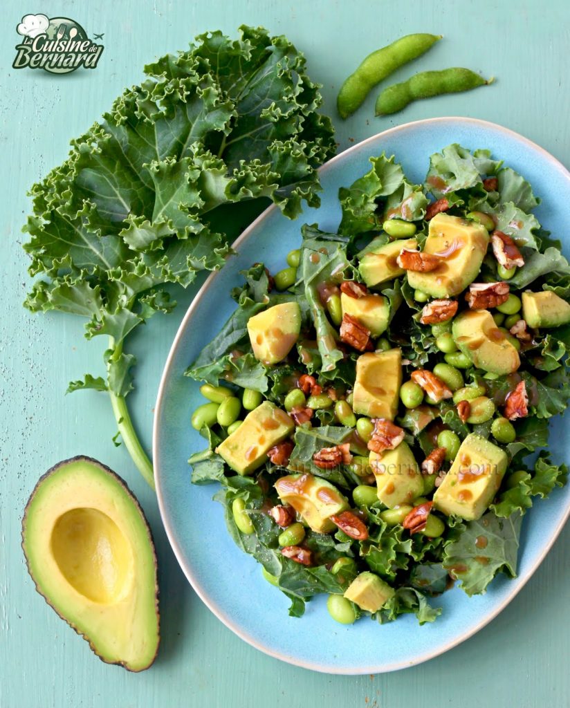 Looking for a nice salad and some green on your plate? I suggest my kale salad with edamame, avocado and pecans. I had eaten a similar one in New York and couldn't wait to make it again. Here I make a delicious sauce with olive oil, balsamic vinegar, tahini and a sweet touch of agave syrup. It is therefore suitable for vegans. But above all it is a salad that will make a real meal. There's a lot of talk about kale, and I hope it's not just a fad, because I find it very hearty and filling. I had made you some ultra crispy kale chips in my Vegemite book that I also featured on video in a facebook live on October 11, 2017 that you can find HERE.
