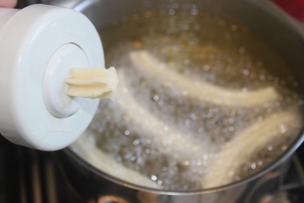 Empieza a enroscar y la masa sale sola. Cuando el aceite esté caliente, haz churros del tamaño deseado y córtalos con un cuchillo. Antes de cortar, desenrosco un poco, sólo para liberar la presión y que la masa no se salga demasiado.