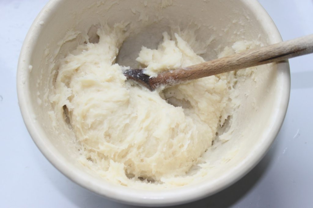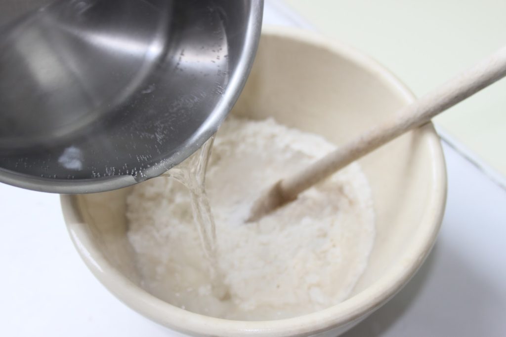 Verter todo de una vez sobre la harina.