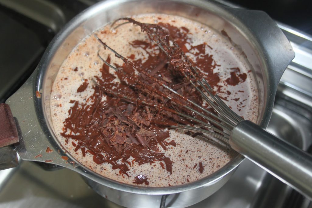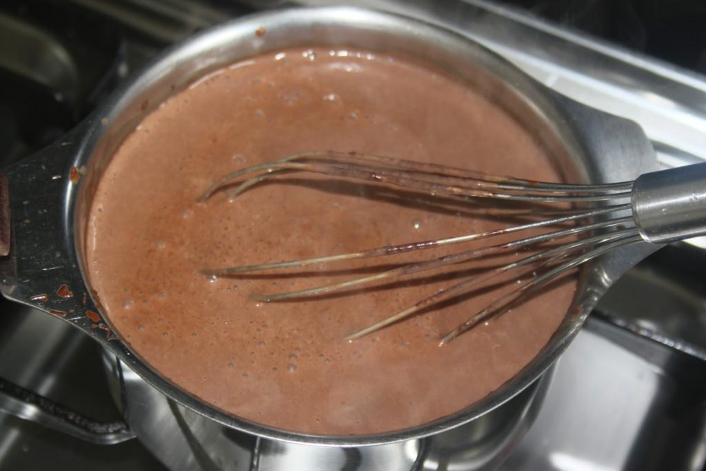A continuación, añada el agua y la leche restantes. Puedes añadir café instantáneo para conseguir un chocolate con mucho cuerpo.