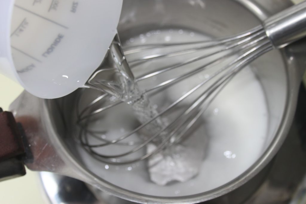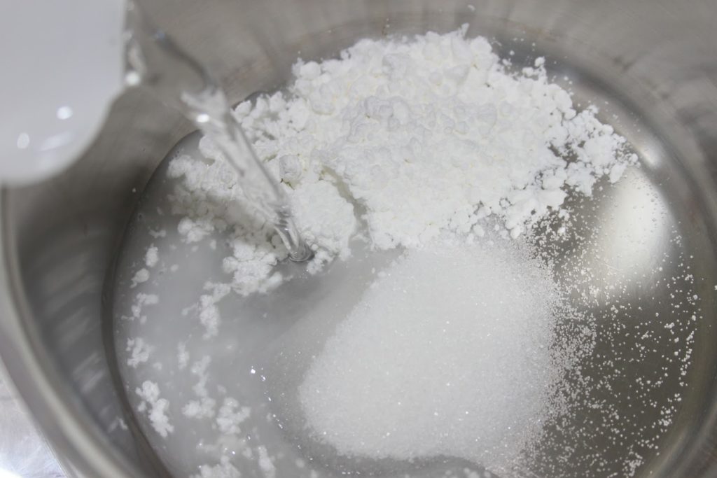 Poner la harina de maíz y el azúcar en un cazo. Añadir un poco de agua para disolver la maicena.