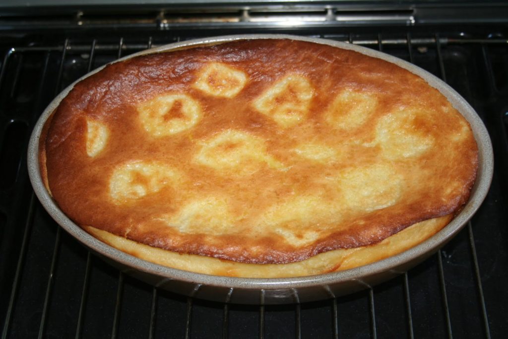 Verter la masa en el plato. La altura del relleno horneado es la misma que la de la masa vertida. Se necesitan menos de dos centímetros. En este momento se pueden añadir al plato ciruelas pasas o uvas marinadas en ron.