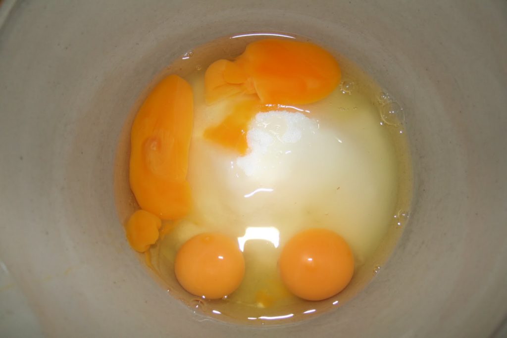Poner el azúcar y los huevos enteros en un bol. Bátalos juntos.