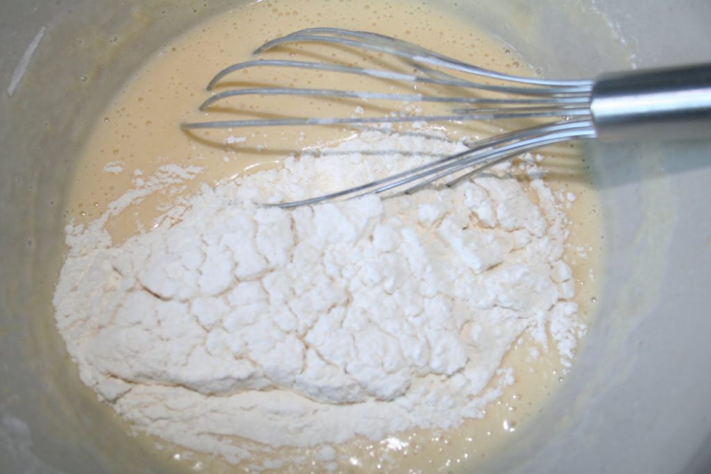 Añadir la mitad de la harina y mezclar bien para evitar los grumos.