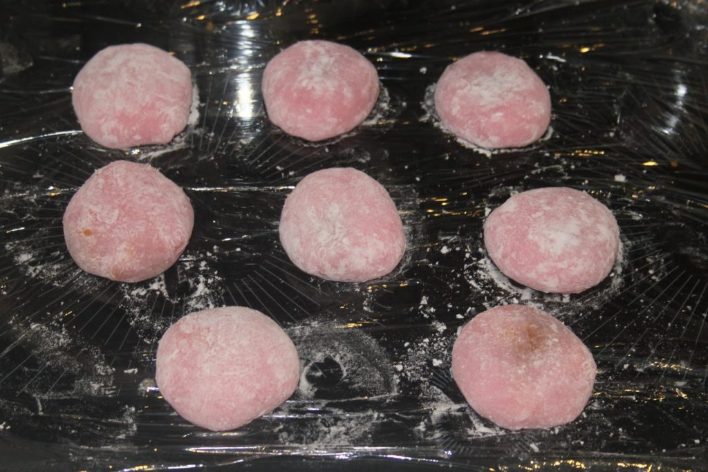 Haz lo mismo con todas las bolas de mochi. Colocar en film transparente y dejar enfriar.
