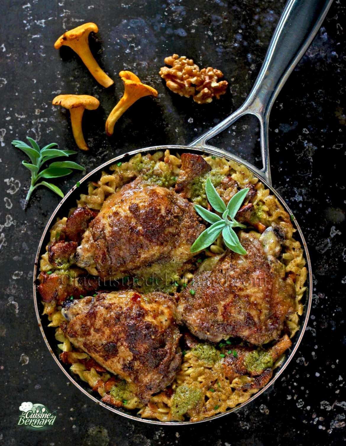 Olav me ofreció una buena colaboración para una receta con sus ollas y sartenes. He estado buscando la manera de ofreceros una receta, en la que todo se hace en la sartén que he recibido. Así que os propongo este plato al que le tengo especial cariño, sobre todo en otoño, ¡mi estación favorita! Todo se hace en una sartén, primero en el fuego y luego en el horno, y está listo en 45 minutos. El pesto de salvia y nueces es una pura delicia, y combina a la perfección con la pasta orzo, preparada con rebozuelos. ¡Por supuesto que puedes cambiar las setas!