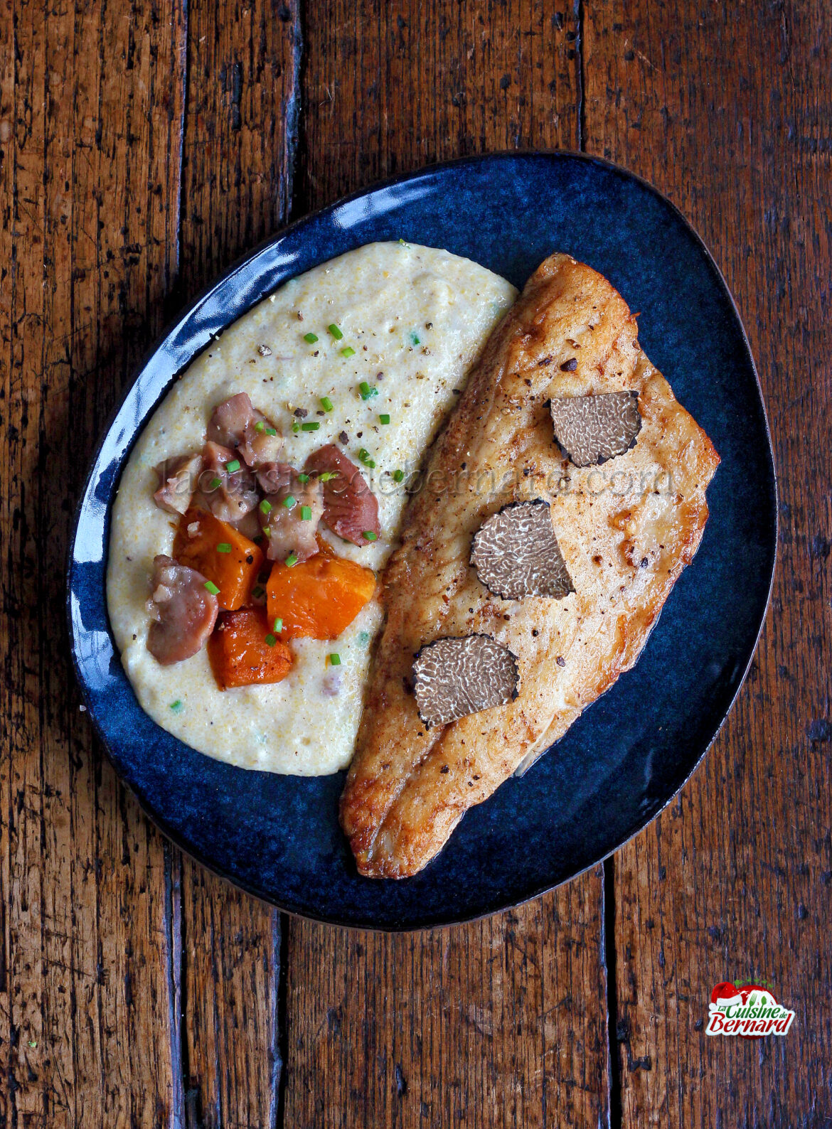Rara vez cocino pescado en mi sitio, aunque me encanta. Para las fiestas, aquí tienes una receta rápida y fácil. Filetes de lubina fritos en mantequilla servidos con una polenta cremosa, listos en menos de 15 minutos. Si vas a servirlo con calabaza asada al horno, tendrás que cocinarla una hora y 15 minutos antes. Y si le añades unas láminas de trufa fresca, ¡es aún más lujoso y festivo!
