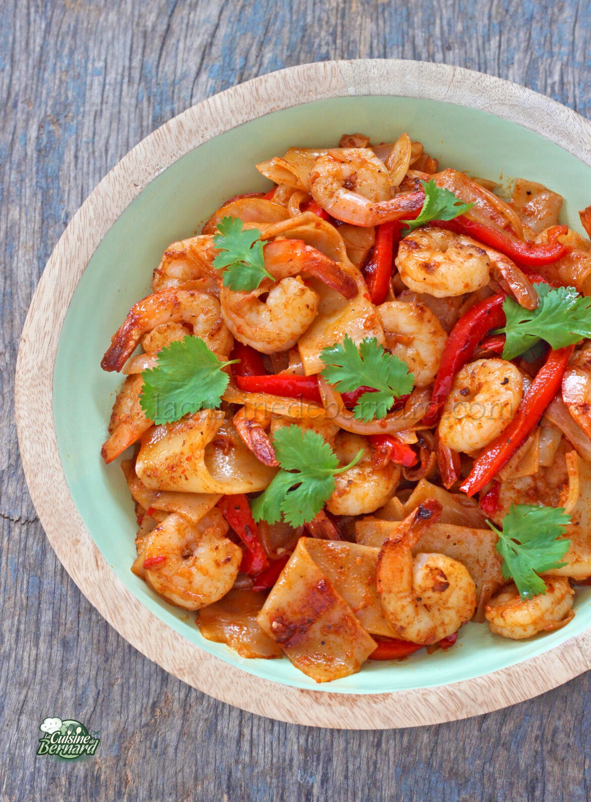 Después de las clases de cocina que doy en mi estudio, a veces me sobran ingredientes. Esto ocurrió después de una clase de cocina tailandesa y comí fideos de arroz frescos. ¡Hice un plato excelente con gambas crudas y polvo satay! Lo más difícil es encontrar los ingredientes. Para ello, ve a una tienda de comestibles asiáticos y encontrarás fideos de arroz frescos en la sección de refrigerados. Si tomas las secas, tendrás que seguir las instrucciones del paquete antes de hacer esta receta. pero ¡todo se prepara en 10 minutos o menos!