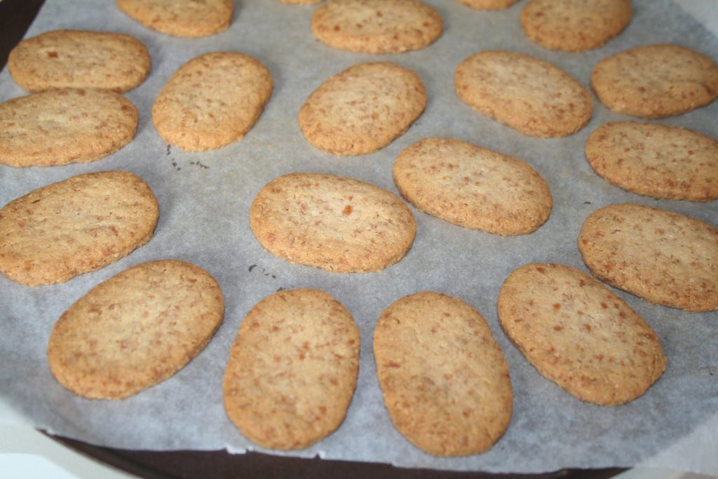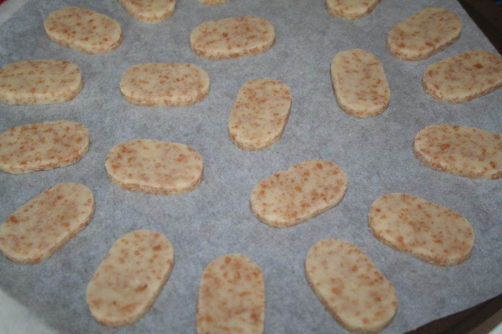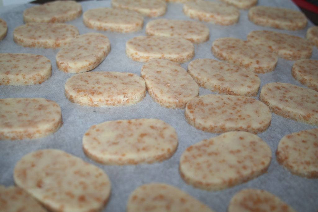 Colocar el shortbread en una bandeja de horno forrada con papel de hornear, espaciando suficientemente , ya que el shortbread se extenderá al hornearse.