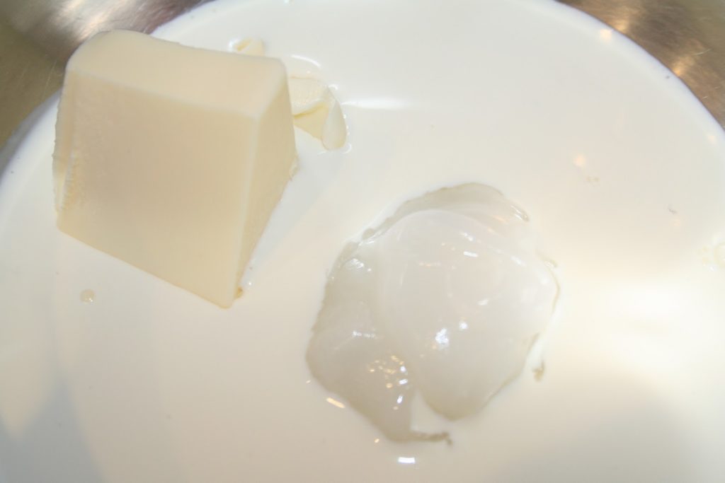 Poner en un cazo la mantequilla, el azúcar invertido (o la miel blanca cremosa) y la nata.