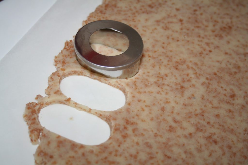 Dejar reposar durante una hora en un lugar fresco. Sacar la masa, retirar las dos hojas de papel sulfurizado y cortar pequeñas galletas de mantequilla con un cortador de galletas.