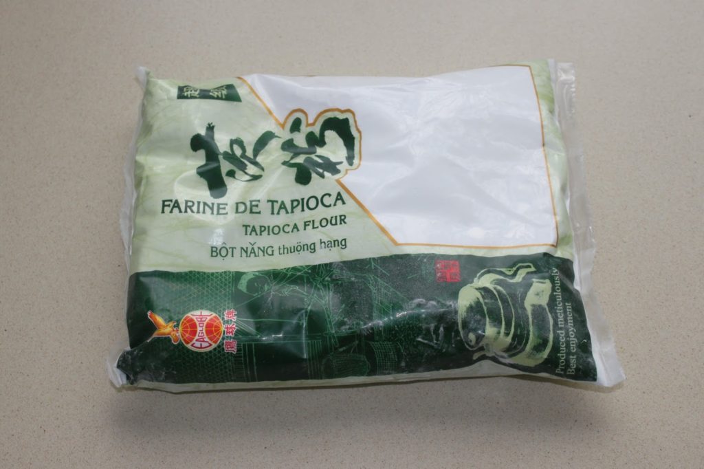 Je fais un petit rappel, même si j’en ai déjà parlé plusieurs fois. Voici la fécule de tapioca qui est parfois appelée farine de tapioca. Il s’agit pourtant bien de fécule et vous la trouverez dans les épiceries asiatiques et dans certaines boutiques bio. Quand vous appuyez sur le paquet, il faut que cela crisse comme de la neige ou de la fécule de maïs…