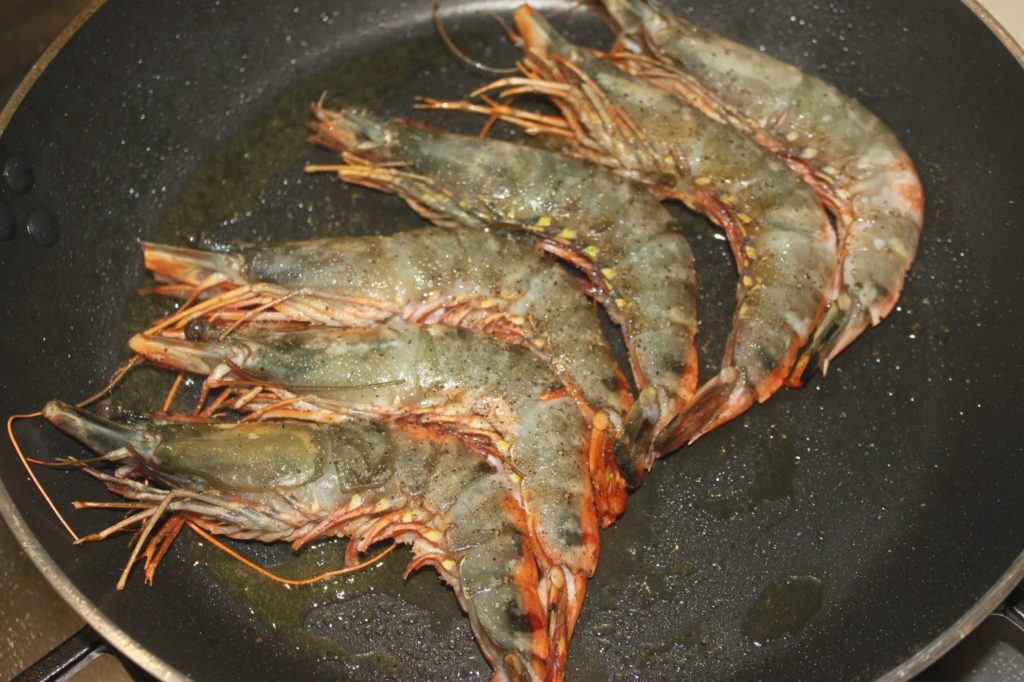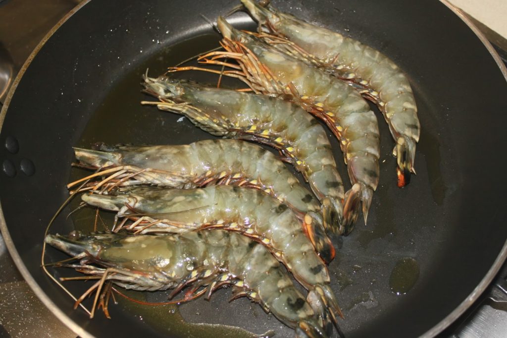 - Pour cette recette, j’ai pris de très grosses crevettes. Versez l’huile d’olive dans une large poêle.