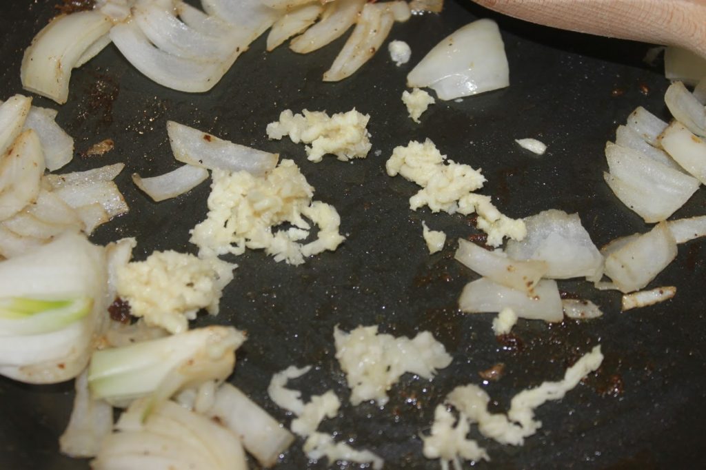 - Dans la même poêle, sans la laver, versez l’oignon épluché et coupé en morceaux. Peu importe que ce soit bien fait car c’est pour le bouillon.