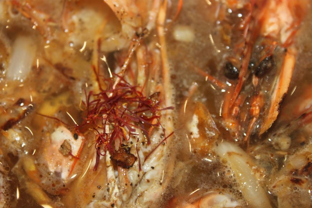 - Versez le tout dans une casserole avec l’eau et le safran et remettez à cuire sur feu modéré.