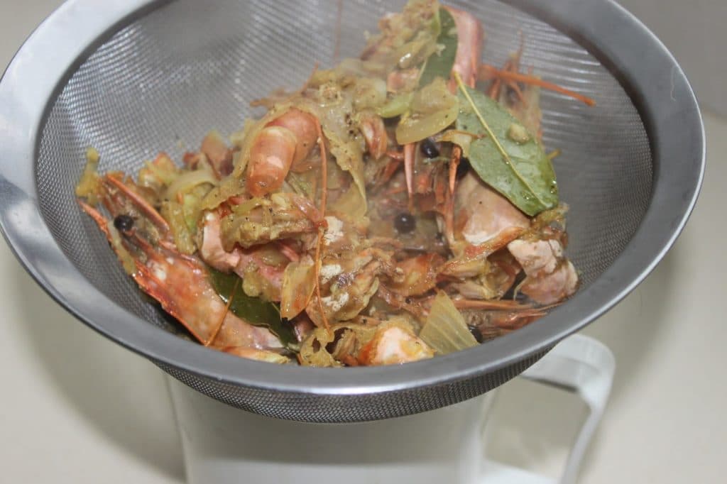 - Mettez les « épluchures des crevettes dans la poêle. Laissez cuire 5 minutes.