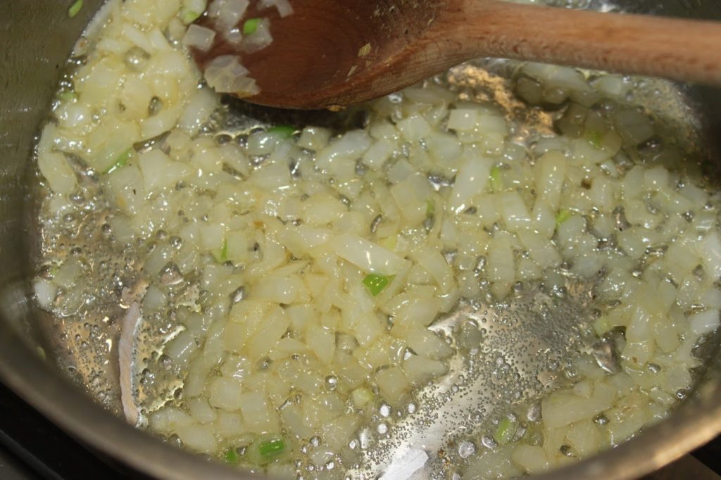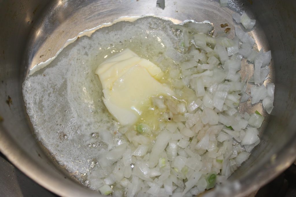 Dans une large casserole, versez le beurre, l’huile d’olive et le demi oignon finement haché.
