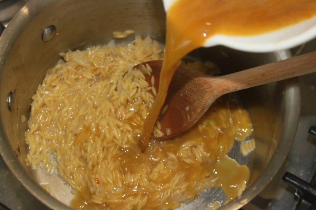 - Dès que le vin est absorbé, versez un peu de bouillon. Remuez-le bien toujours avant de le verser. Faites cuire cette fois sur feu doux en mélangeant régulièrement. Quand les pâtes ont presque tout absorbé, versez davantage de bouillon.