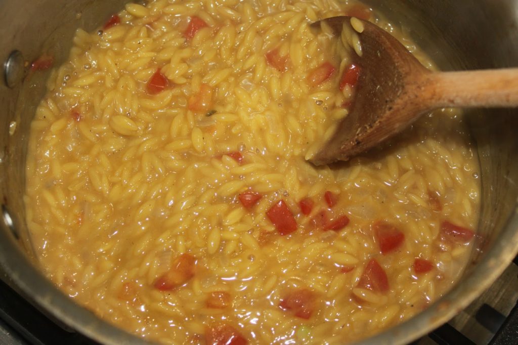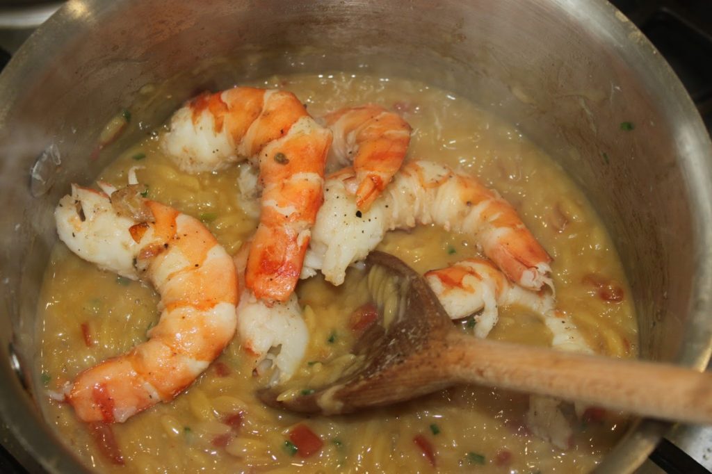 - Vous ne serez peut être pas obligés de mettre tout le bouillon. Les pâtes cuisent en général en 9 minutes. À vous de voir si vous voulez un plat très crémeux, au quel cas il faudra mettre presque tout le bouillon, ou alors si vous voulez un plat plus consistant avec moins de bouillon. Pour moi, c’était presque 1,5 litre de bouillon. Replacez les crevettes et laissez cuire sur feu très doux 3-4 minutes pour bien les réchauffer dans le kritharoto.
