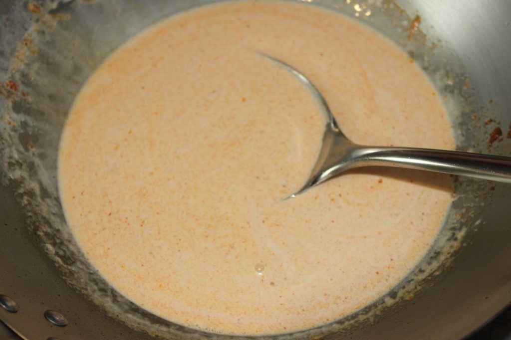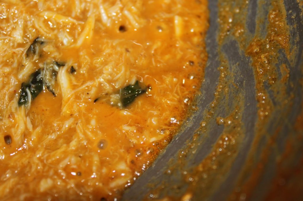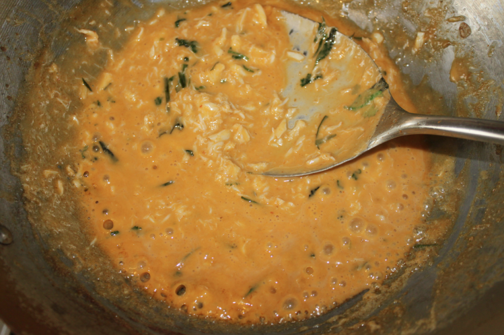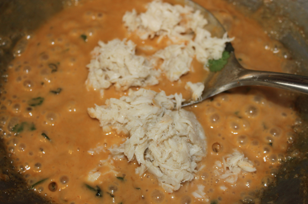 - Quand le lait commence à vraiment épaissir (comme une crème anglaise) ajoutez la chair de crabe.