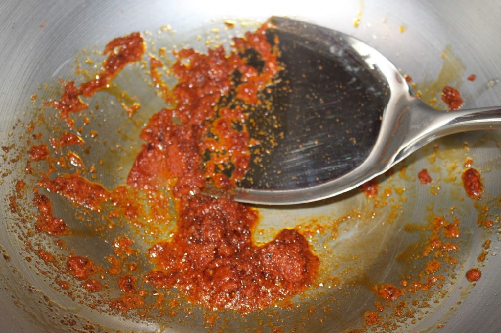 - Versez l’huile et la pâte de curry dans le wok sur feu fort.