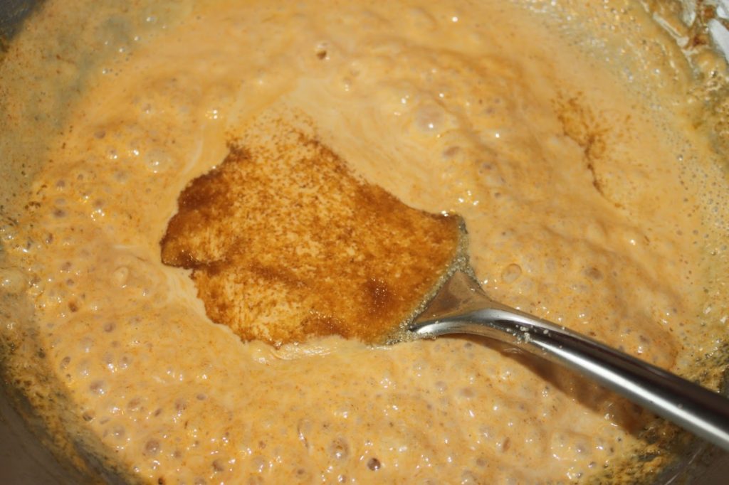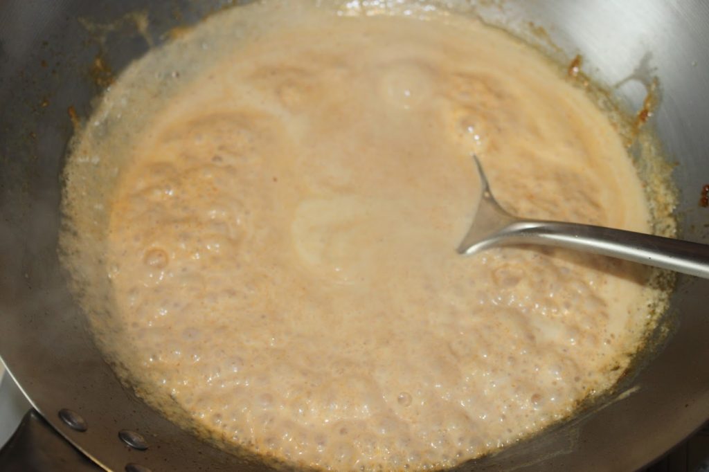 Versez le reste de lait de coco et faites de nouveau bouillir. Quand le lait épaissit, ajoutez le sucre et le nuoc mâm.
