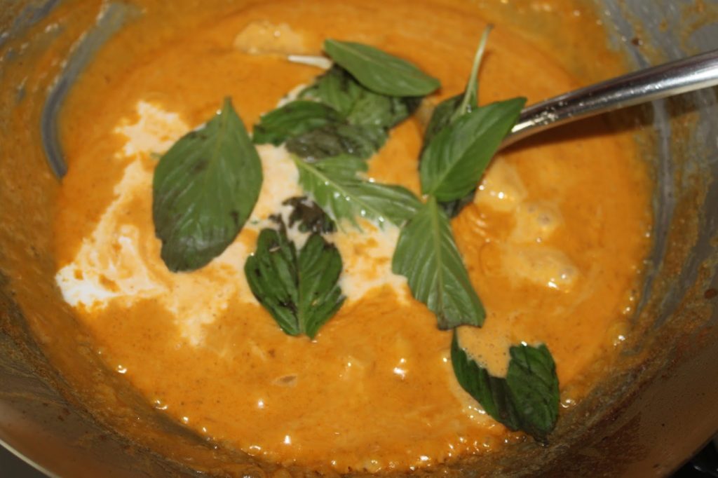 - Ajoutez une partie des feuilles de votre basilic thaï. J’en rajoute en fin de cuisson car il noircit très vite à cause de la chaleur.
