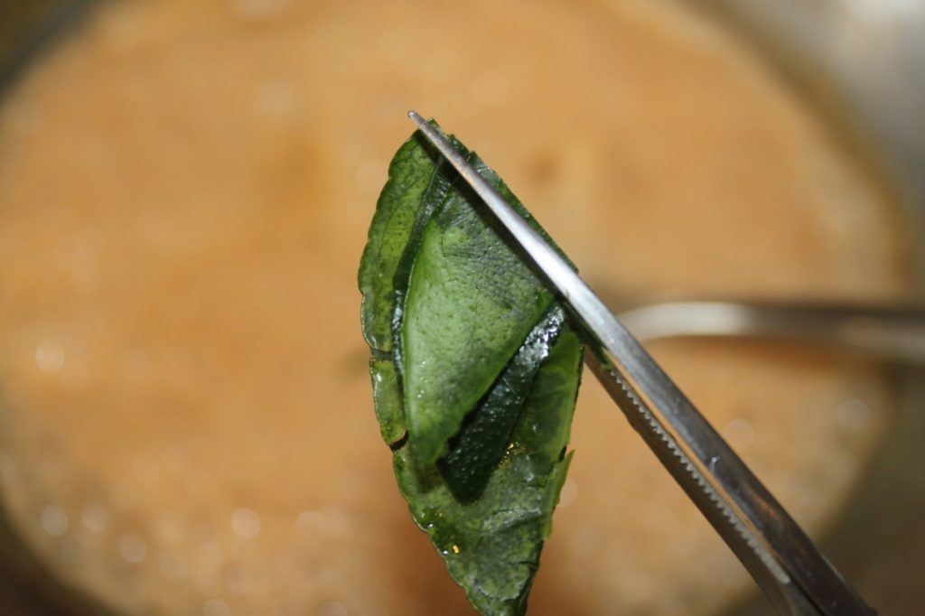 Ajoutez une partie des feuilles de votre basilic thaï. J’en rajoute en fin de cuisson car il noircit très vite à cause de la chaleur.