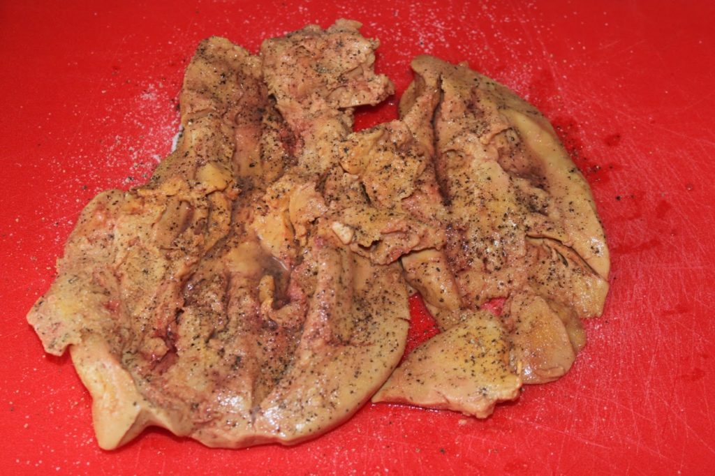 Salez et poivrez toutes les parties visibles du foie. Versez un petit peu d’alcool de votre choix. Je mets souvent un mélange de porto et cognac.