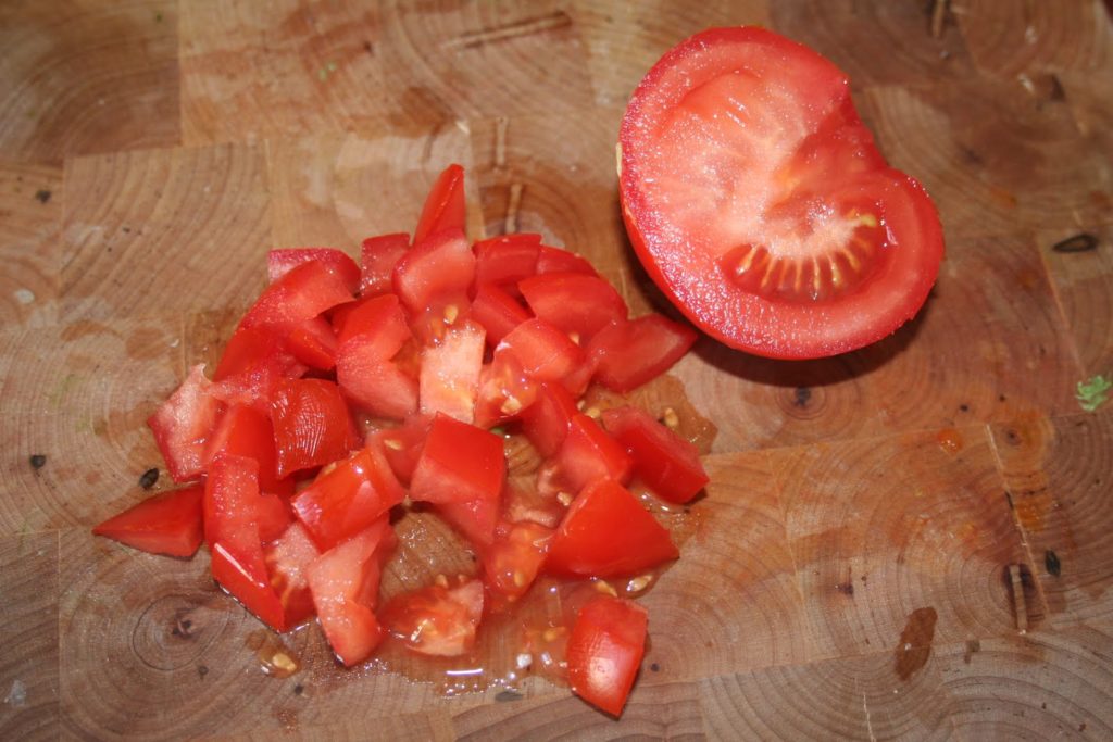 - Ajouter la tomate (en gardant le jus qui est acide et qui va empêcher l’oxydation de l’avocat) coupée en morceaux (petits cubes).
