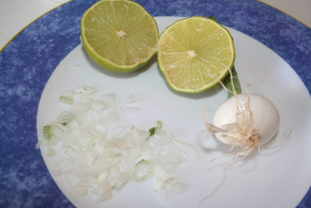 - Ajouter également le jus de citron vert (un demi citron suffit) et un petit oignon blanc coupé en très petits morceaux.
