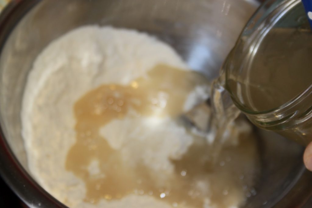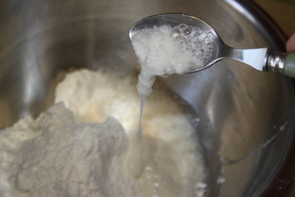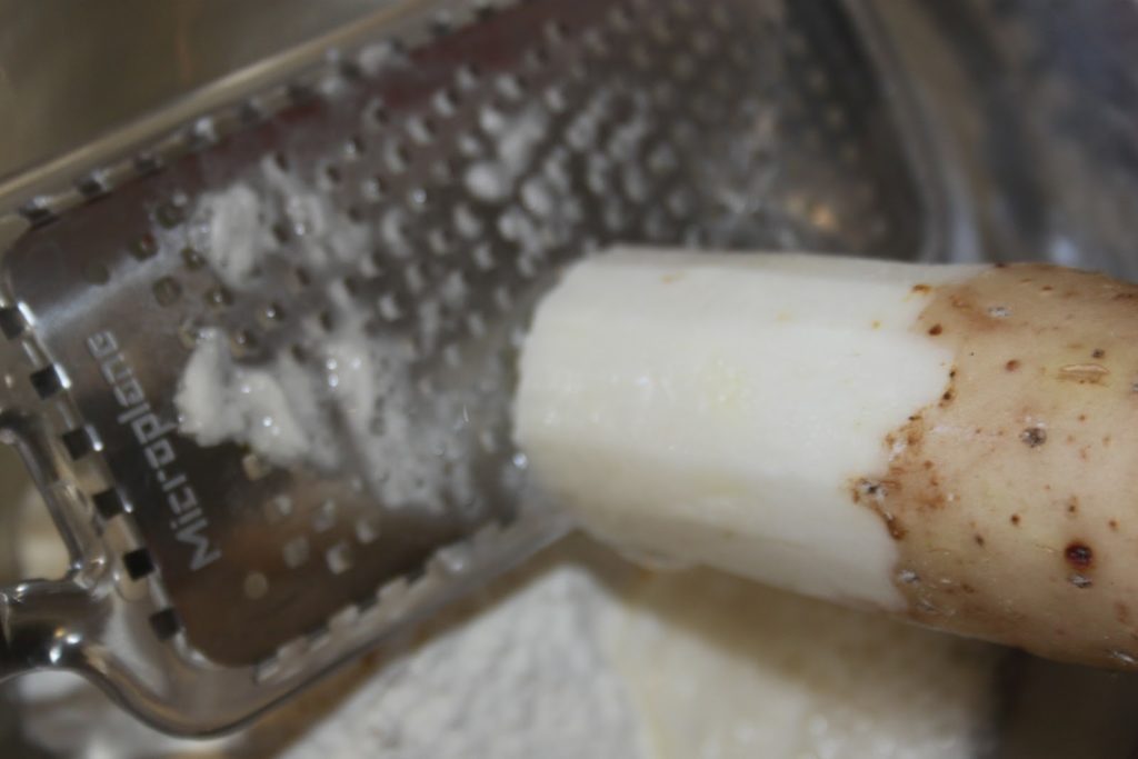 - Diluer les 3g de dashi dans l’eau tiède. Verser un peu sur la farine+igname.