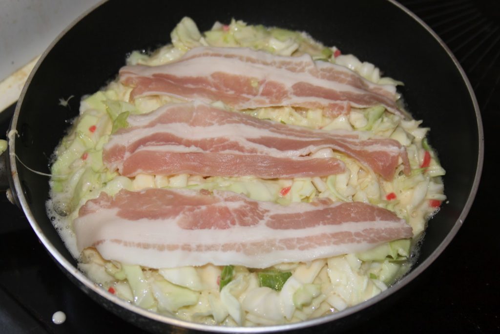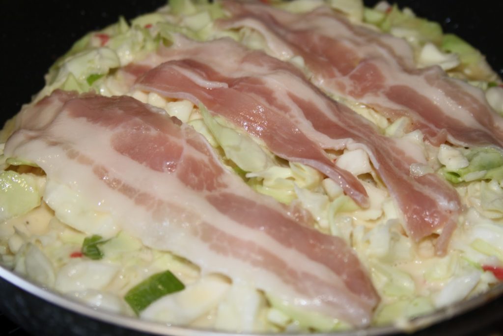 - Poser dessus 3 ou 4 tranches de bacon. On peut remplacer par des crevettes ou du poulpe ou ce que vous voulez!