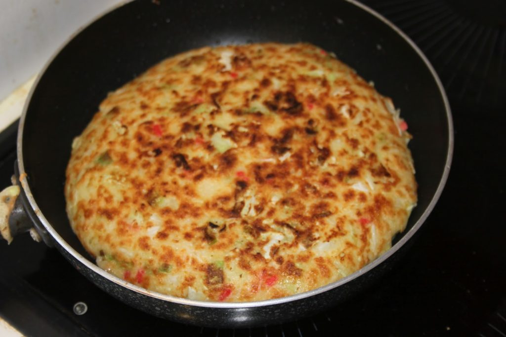 - Quand la pâte commence à cuire sur les côtés, retourner l’okonomiyaki. Cela prend tout de même 8 à 10 minutes sur feu modéré. Deux méthodes: le lancer de crêpes (ce que j’ai fait ici…) ou alors le retournement avec couvercle plat (comme je l’avais expliqué dans la recette de la tortilla).