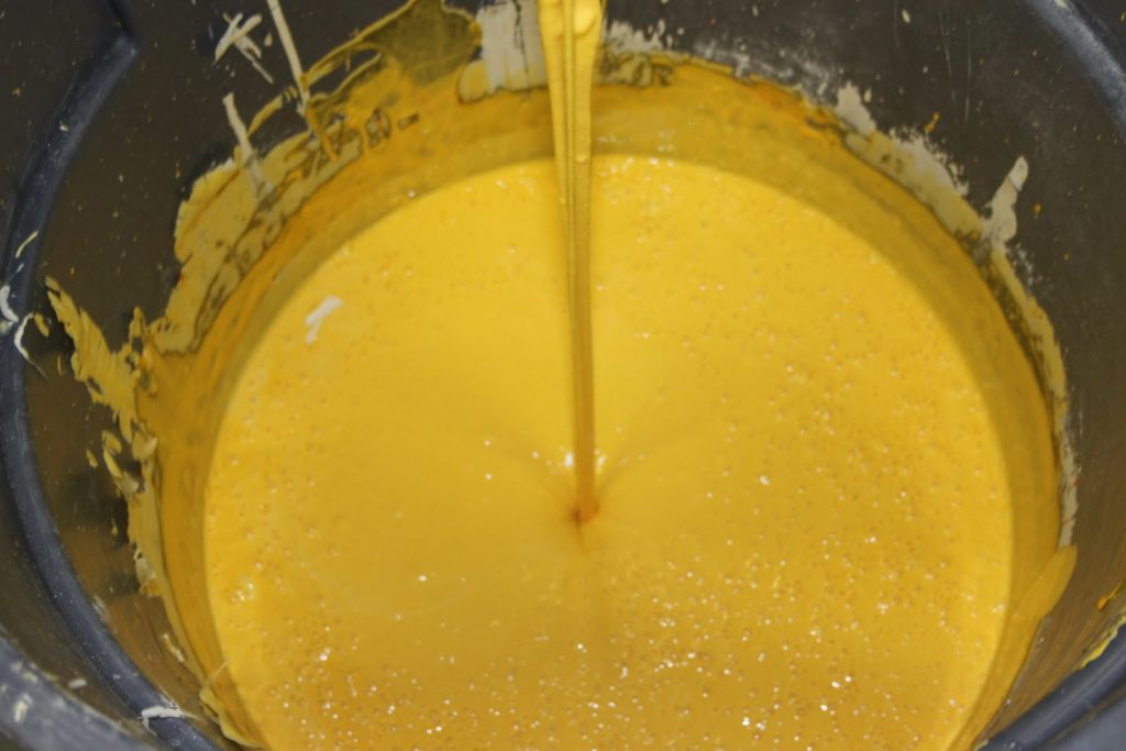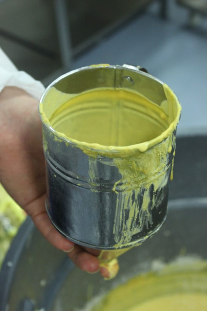 Qu’y a-t’il dans la zlabia? Simplement de la farine, de la levure et de l’eau. Sans oublier un colorant qui peut varier suivant l’humeur du pâtissier, mais qui se situe toujours plus ou moins dans une gamme chromatique jaune-orangée. La pâte repose plusieurs jours. En réalité on la laisse fermenter. On ajoute la couleur le jour de la cuisson. La pâte est d’une consistance assez épaisse mais fluide, comme une pâte à crêpe, plus lourde et visqueuse.