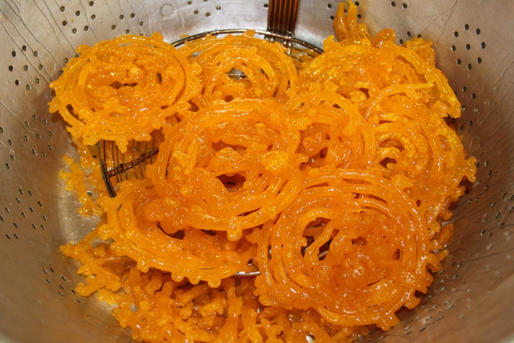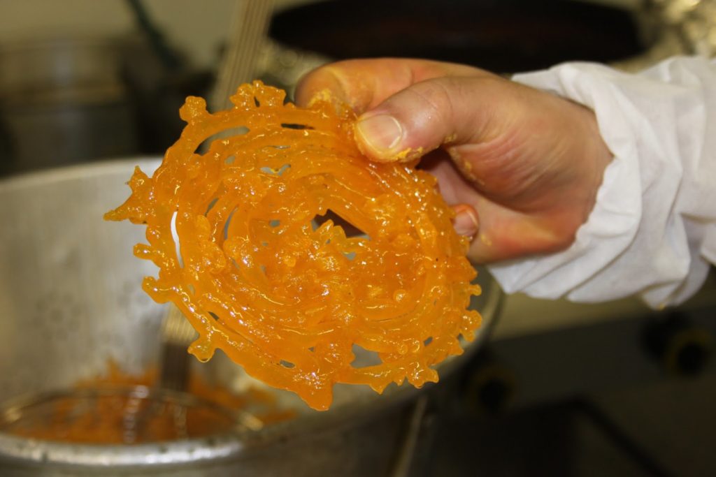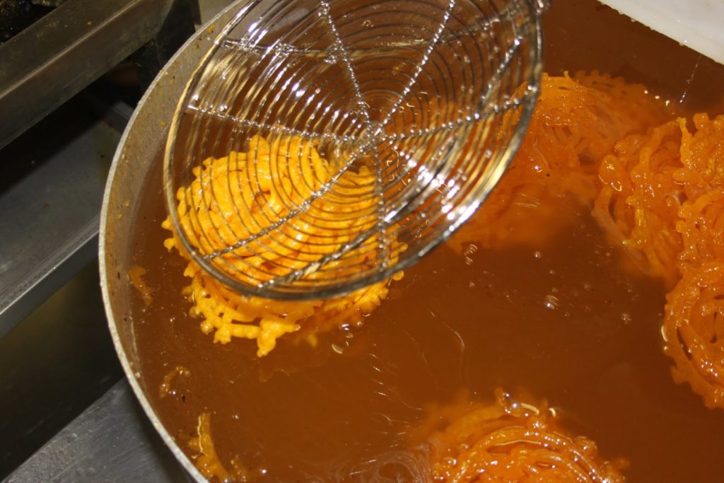 Dès que les zlabias sont cuites, on les plonge tout de suite dans un large bain de miel à la fleur d’oranger.