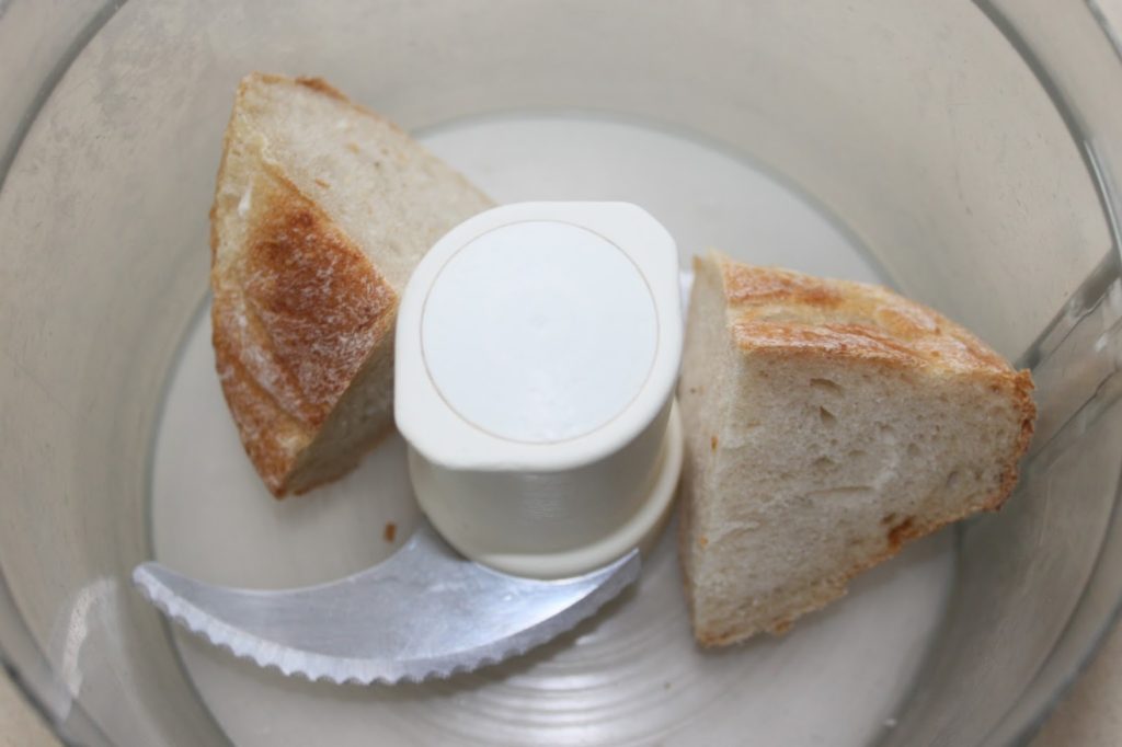 - Pour cette recette, j’ai pris du pain rassis qu’il me restait de mes essais de proportions pour le pain maison (recette ICI).