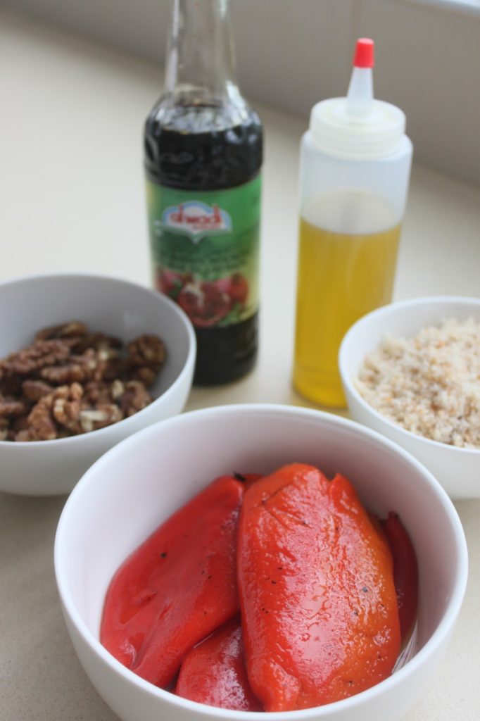 - Et voici les autres ingrédients. Les poivrons rouges grillés, les noix, l’huile d’olive. Pour les poivrons, vous pouvez prendre des poivrons en bocaux, déjà grillés. Sinon, vous faites comme moi et vous les préparez au four. Pour les détails c’est par ICI !