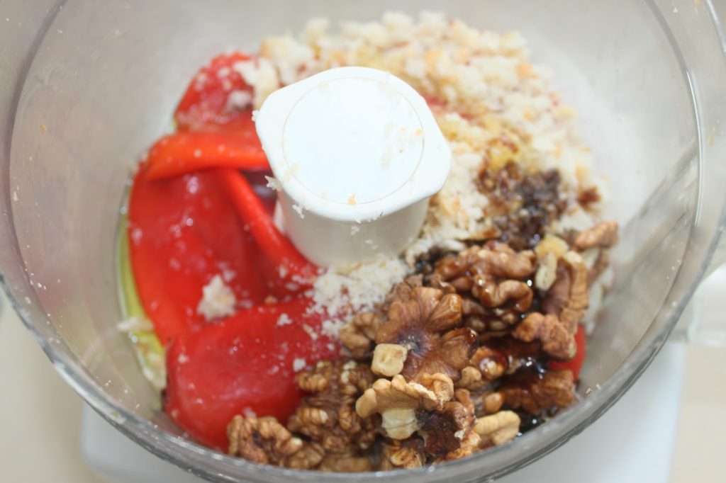 Mettez tous les ingrédients au mixeur: huile, pain en miette (ou chapelure) poivrons, noix, mélasse de grenade.