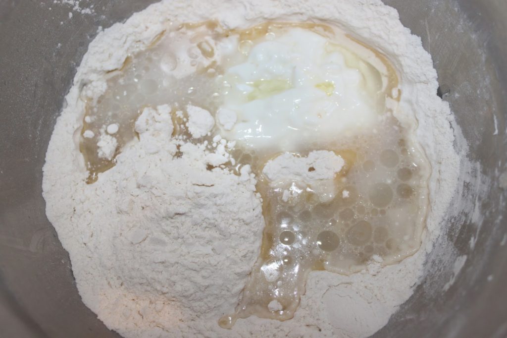 Mélangez à la main (si vous n’avez pas de robot) ou avec le crochet pétrisseur pendant une bonne dizaine de minutes puis faites pousser dans un endroit tiède pendant 1h30 à 2h.