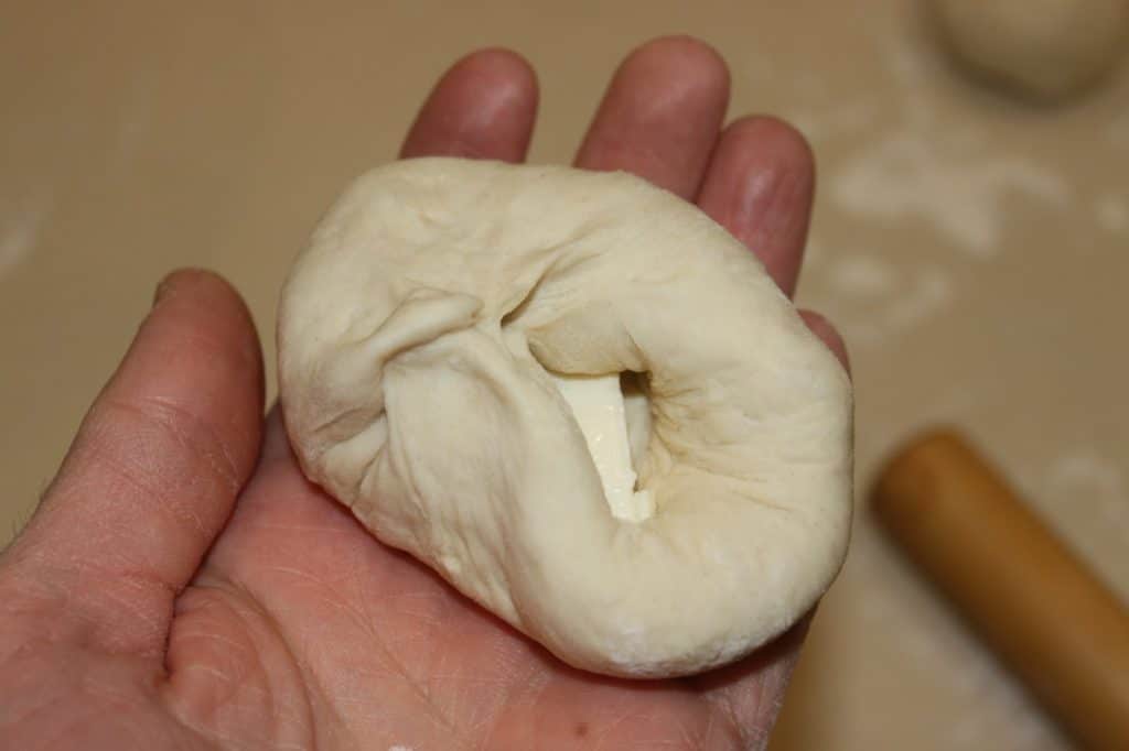 - Rabattez doucement la pâte autour du fromage. Fermez bien pour rendre le tout totalement hermétique et éviter ainsi que le fromage sorte.