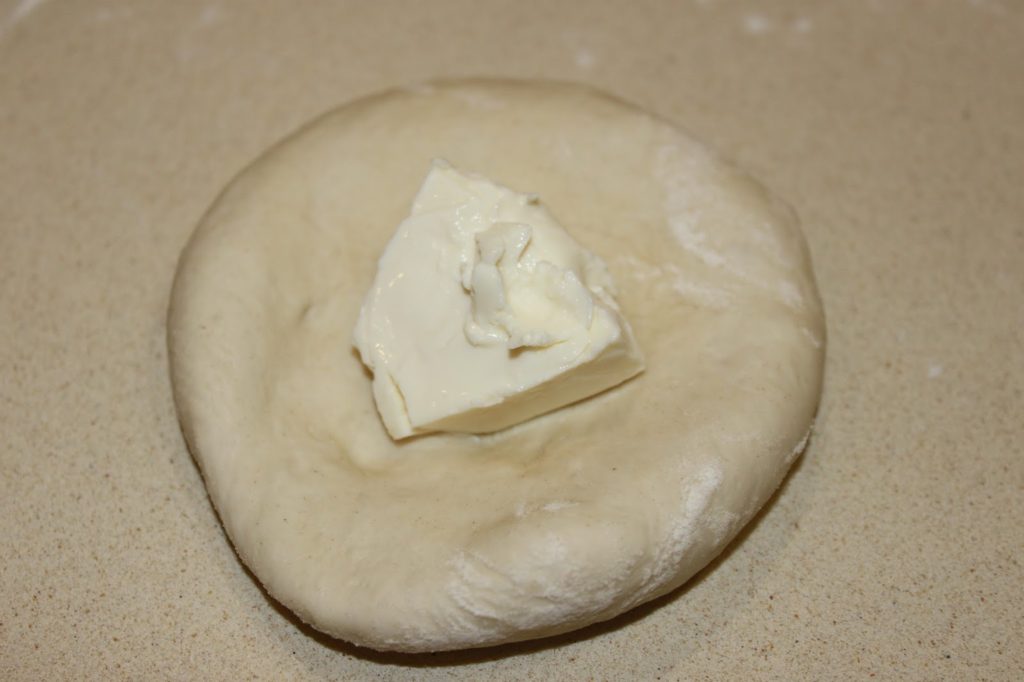 Étalez une première boulette en une petite crêpe aplatie avec un petit rouleau à pâtisserie. Mettez une « vache qui rit » au centre (en l’écrasant un peu pour casser le triangle). Pour les naans « nature », passez cette étape.